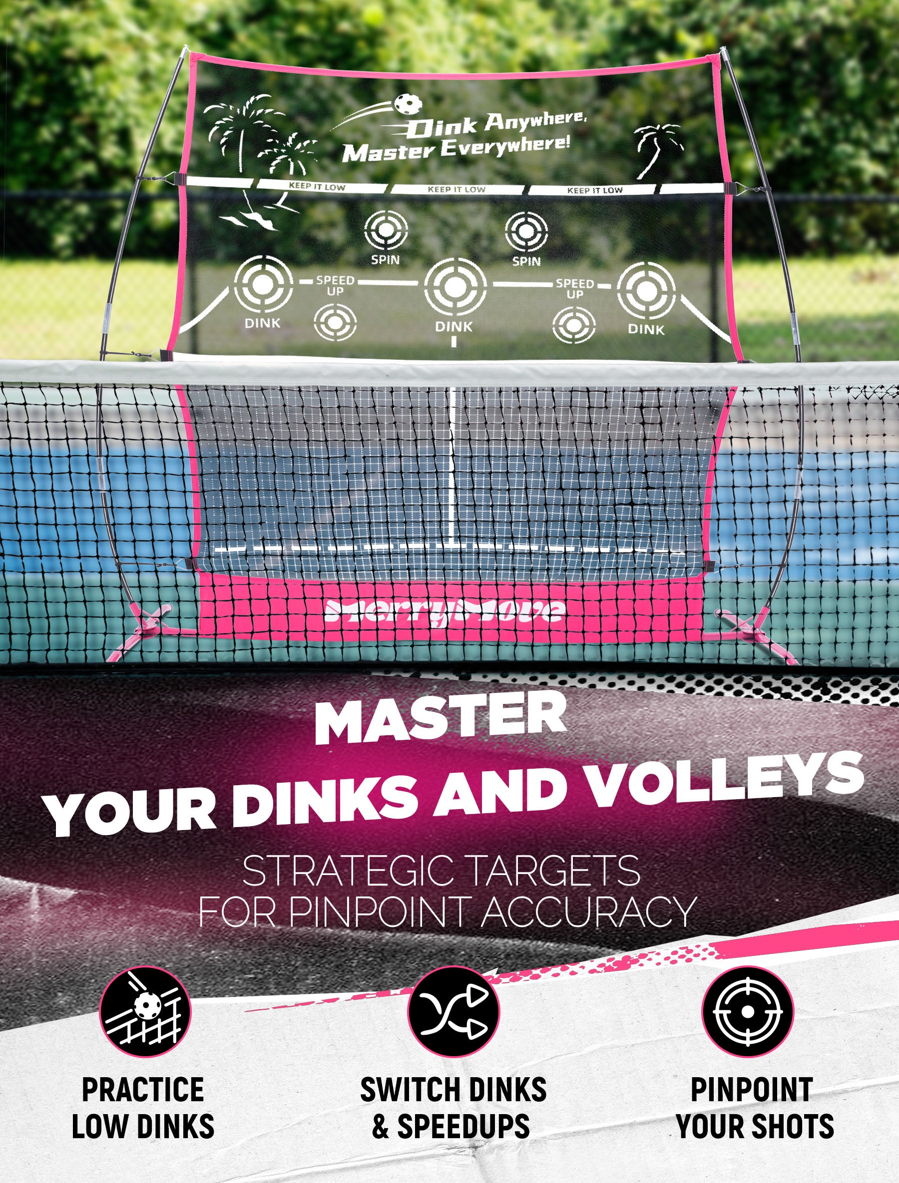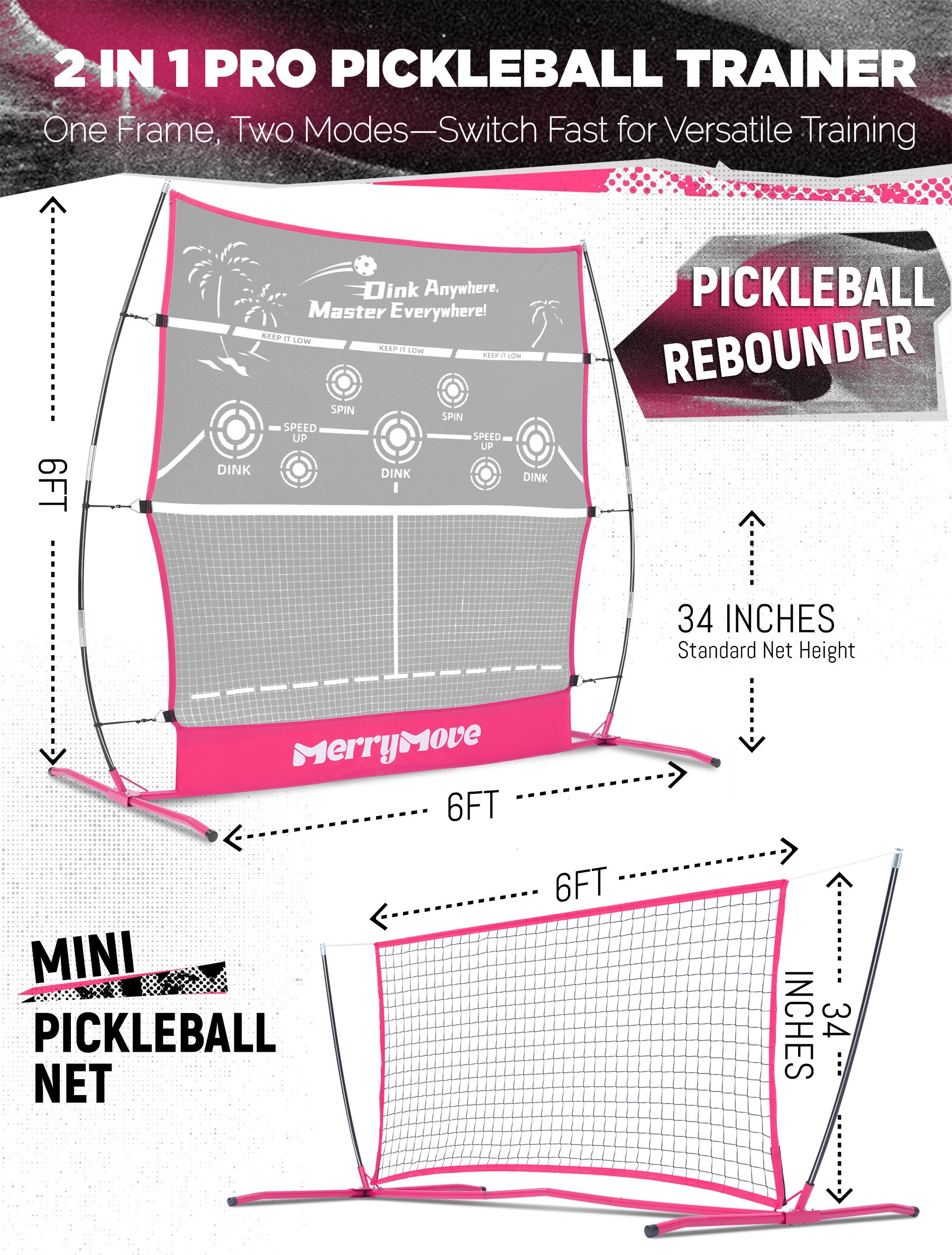- Pickleball Training Equipment (Pink Edition): Master the Game in Style! Level up your pickleball skills with this vibrant 2-in-1 Pink Practice Rebounder & Mini Net! Designed for all players, its eye-catching pink finish adds a fun twist to solo drills or partner games. Perfect for teens, adults, and anyone who loves to train with flair